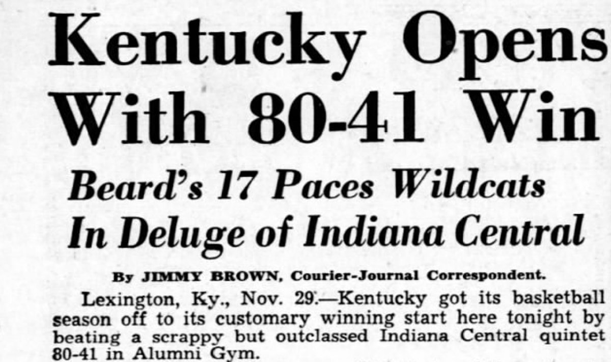 "Kentucky's Wildcats clicking with the precision that carried them to the national collegiate basketball throne last season, opened 1948-49 play tonight with a 74-38 victory over Indiana Central," reported the AP. "The Wildcats started moving soon after the opening whistle and had a 33-14 lead to grow on at halftime."