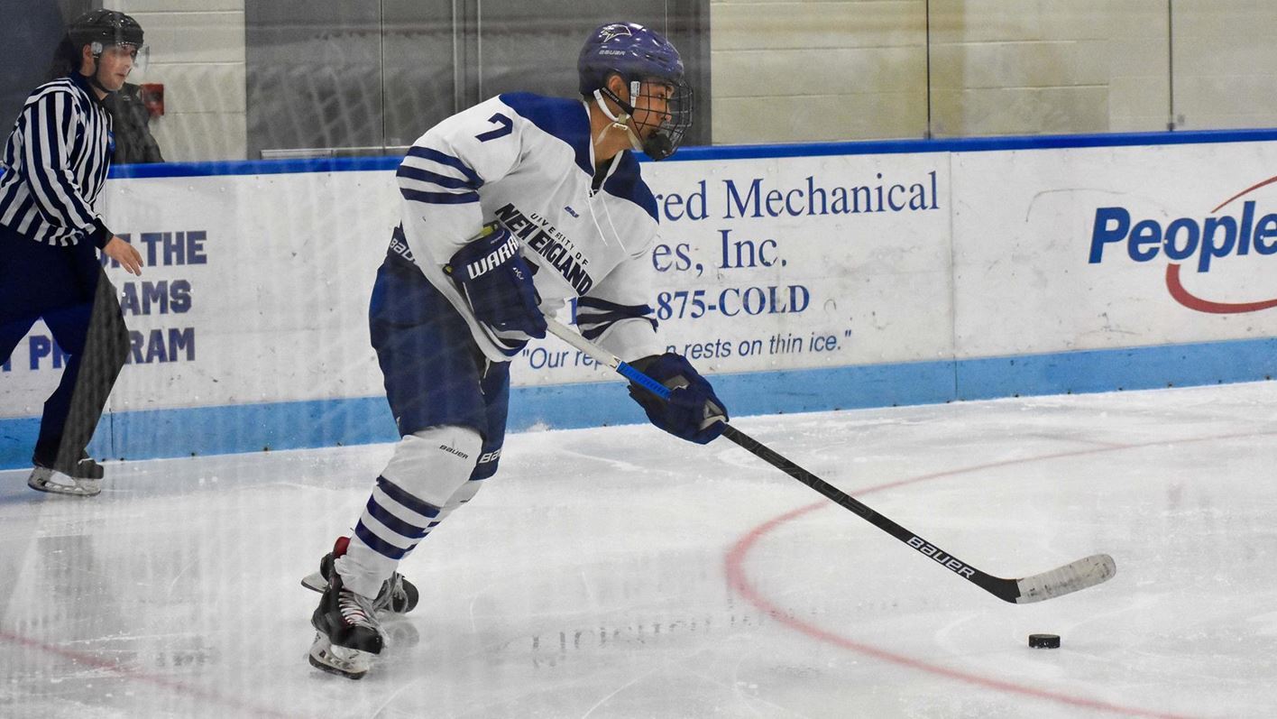 After a scoreless first period in the first of four DIII men's hockey quarterfinals on Saturday, U New England struck first in the second period, taking a 1-0 lead on Daniel Winslow's short-handed goal, and U New England added another goal, an empty-netter, from Tyler Seltenreich in the third period to win 2-0.