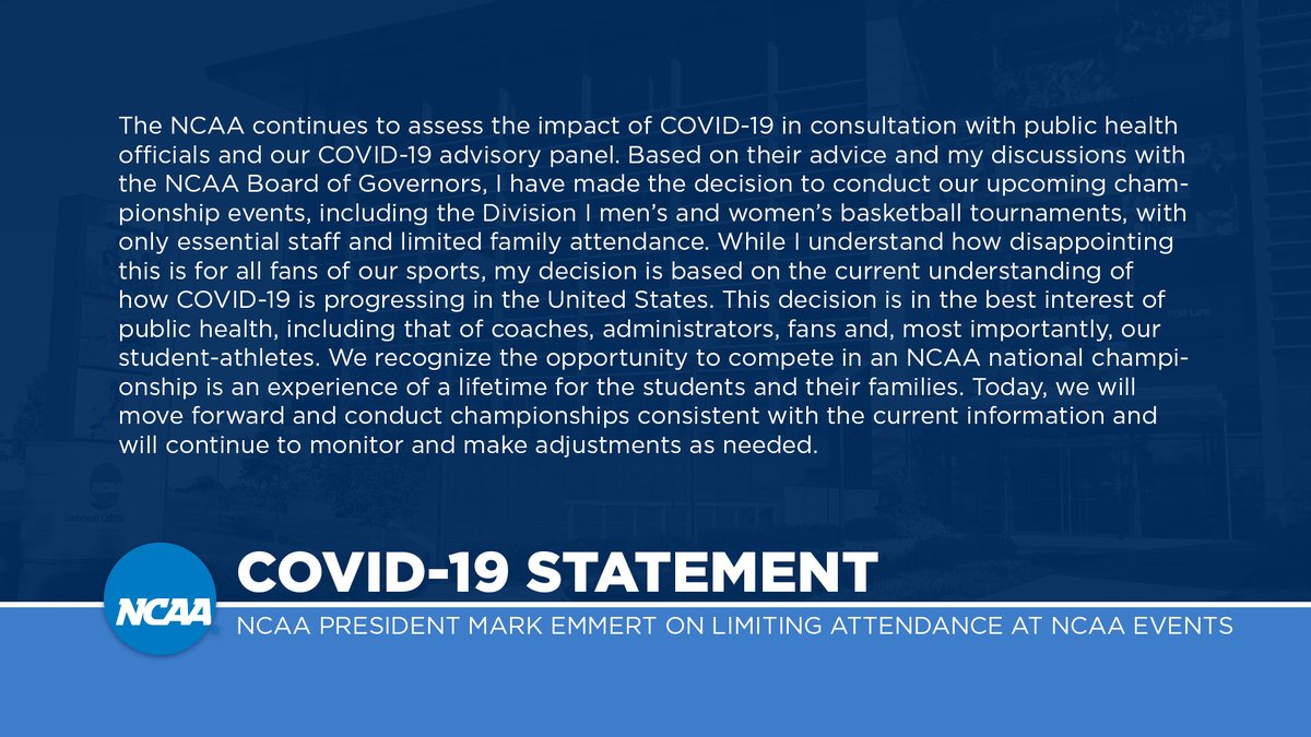 - NCAA president Mark Emmert announced the decision yesterday to play all "championship events, including the Division I men’s and women’s basketball tournaments, with only essential staff and limited family attendance," in response to the safety and well-being of student-athletes during the uncertainty of the coronavirus.