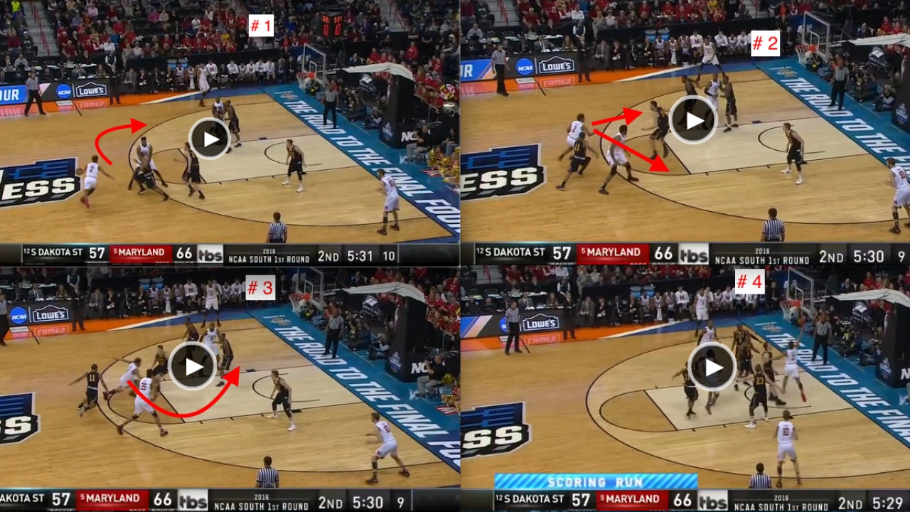 A quick first step creates all the space needed to get the shot off, and boy did Perrantes need it here. More to the point, in coach Bennett’s mover-blocker offense, we are still seeing the same screening action along the baseline and free-throw line areas.