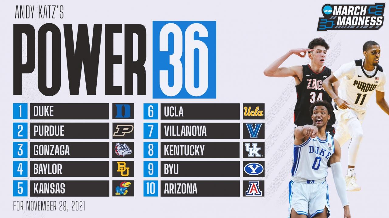The debate for the No. 1 team this week is legitimately a toss-up. Going with Duke or Purdue makes total sense. Duke beat Gonzaga in Las Vegas. Purdue still has the comeback win over Villanova on its resume and it hasn’t lost. Both teams look the part of the best team in the country. The Zags shouldn’t drop below third in the AP poll and it won’t in the Power 36 because all they had was a three-point loss to Duke after crushing UCLA. And Baylor could make a case for a top spot after staying undefeated by winning the Battle 4 Atlantis.