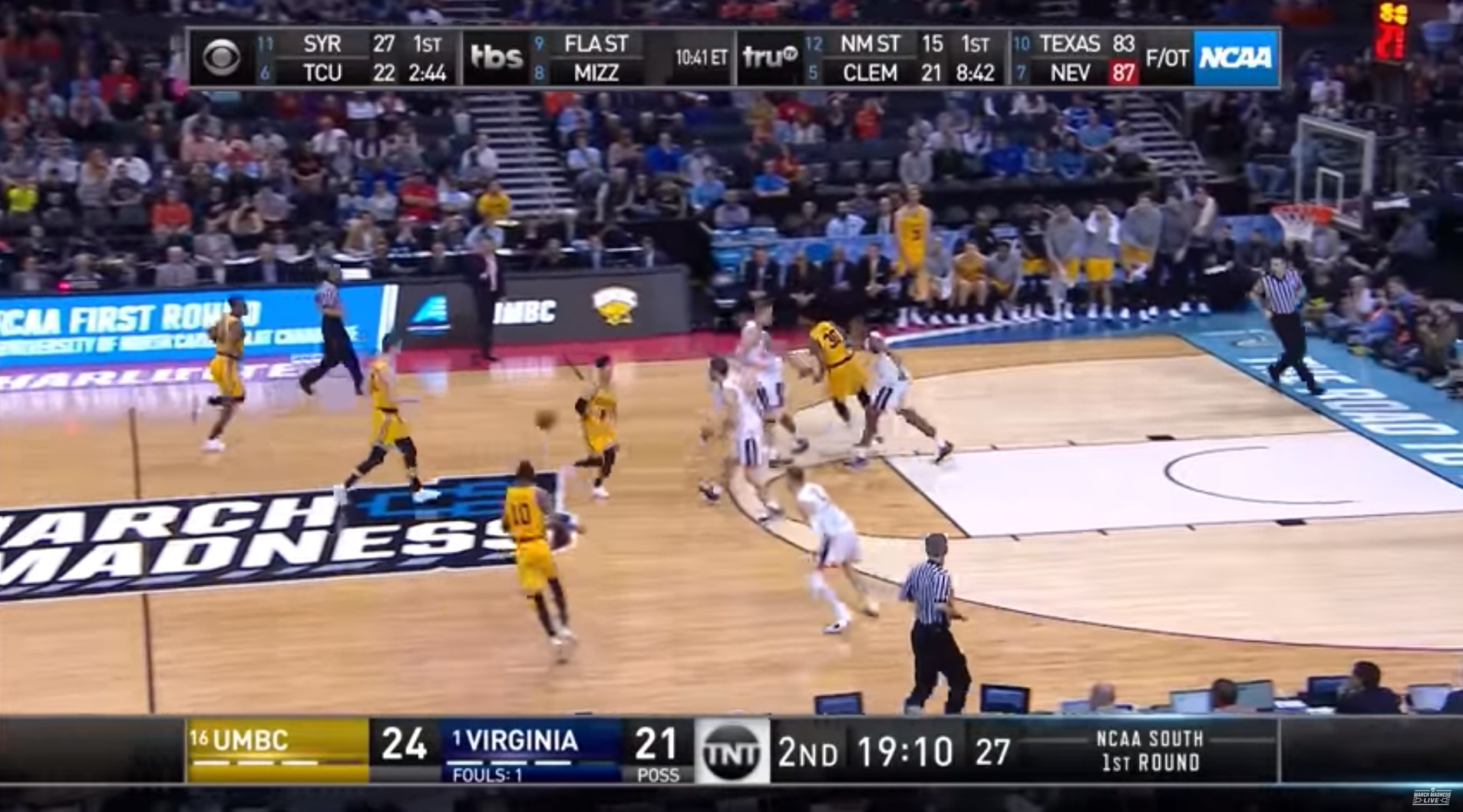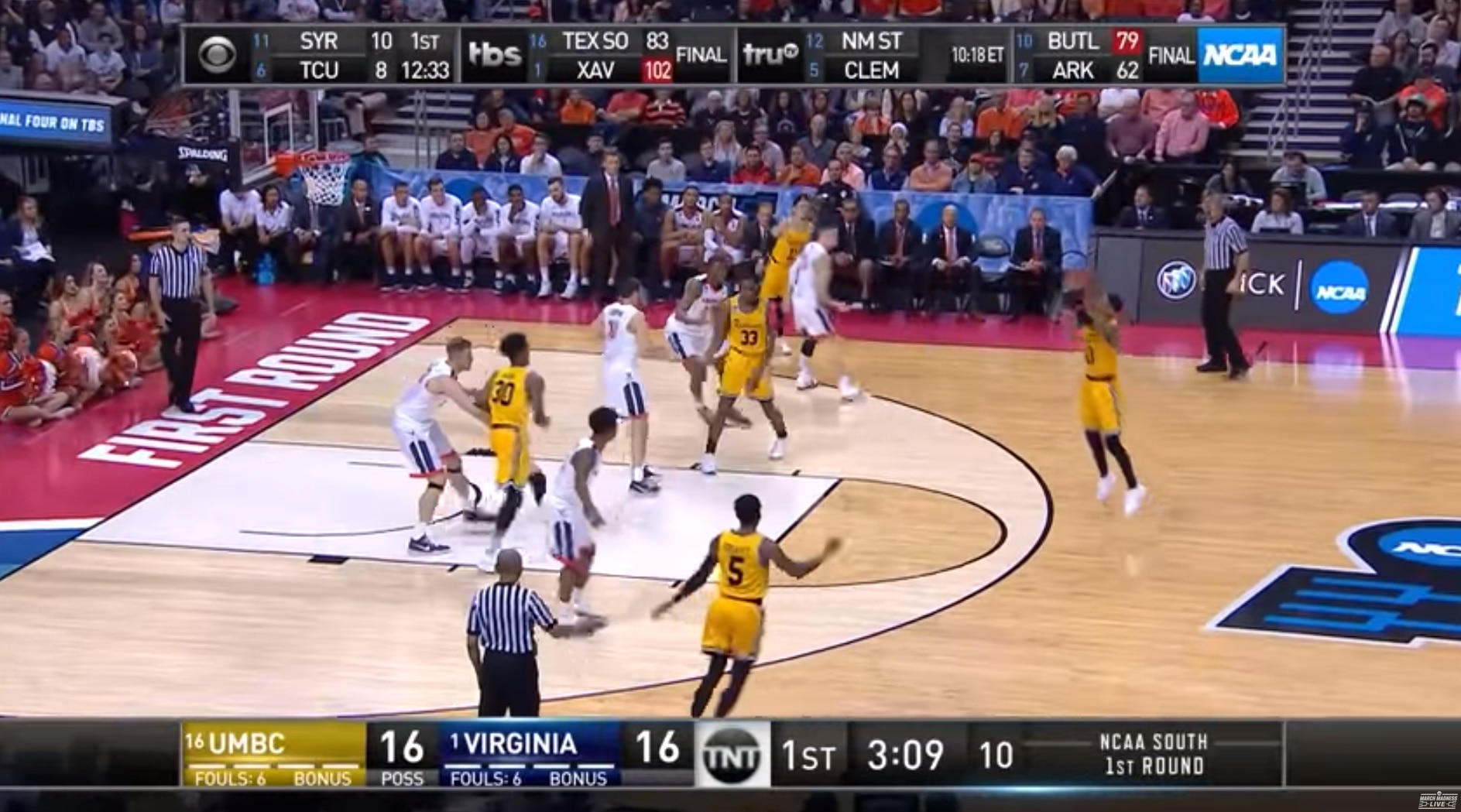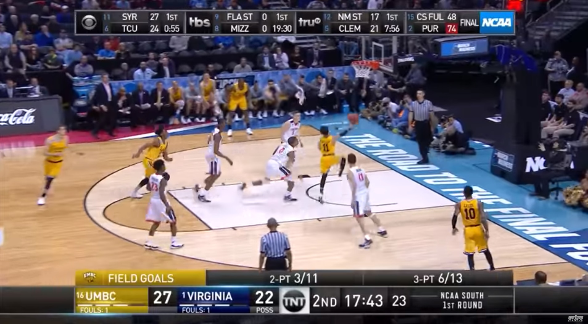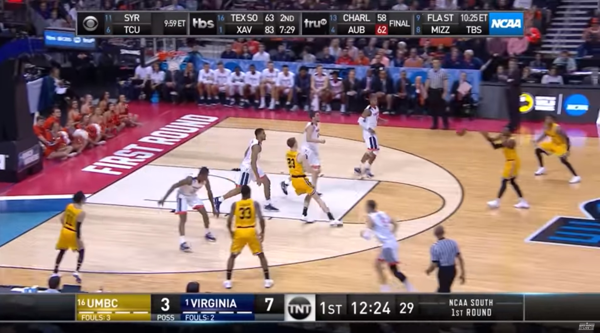 "By the way, on this trip down the floor, trying to take the lead, eight and a half minutes in," Nantz said, when UMBC had the ball, trailing 7-6.