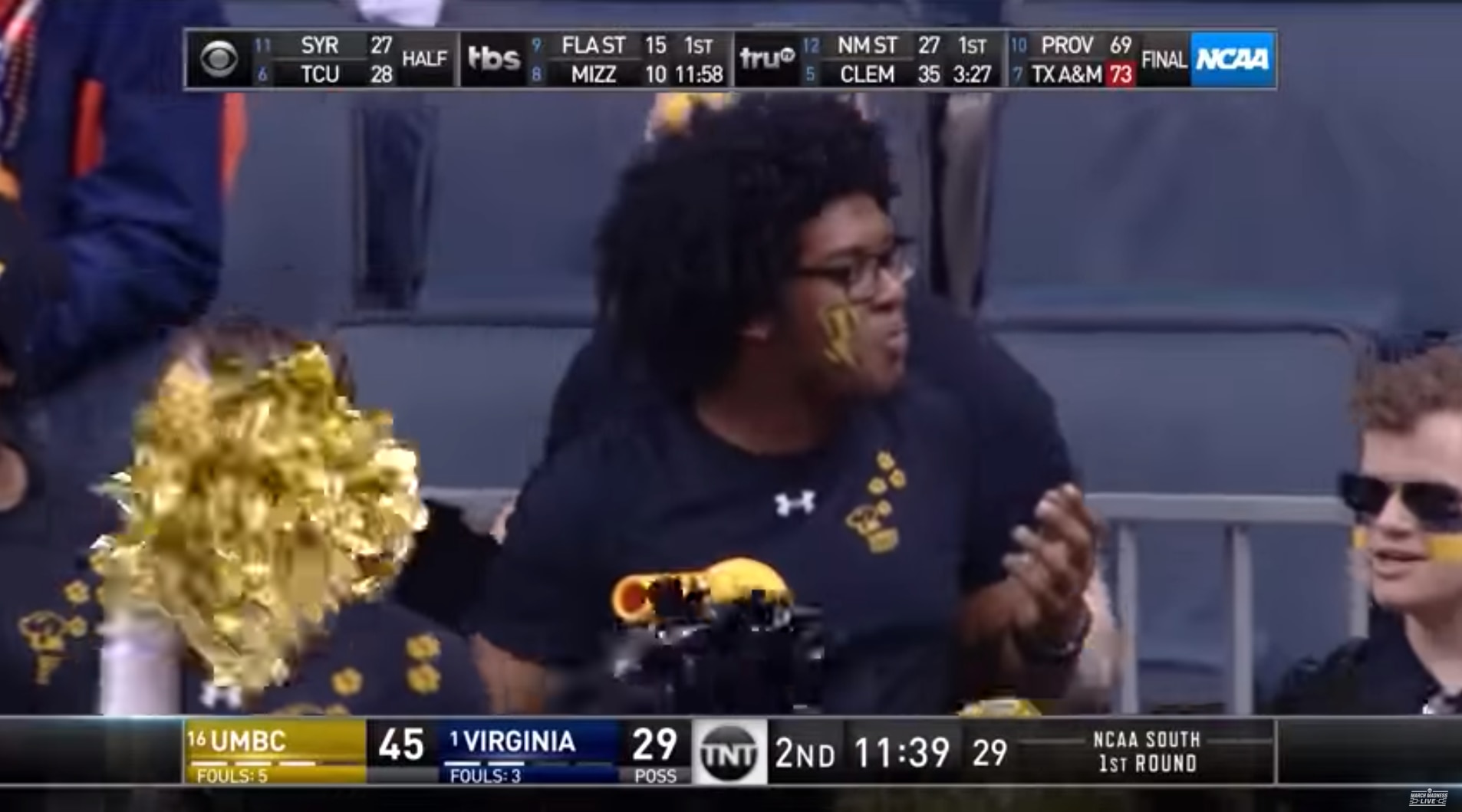 UMBC's fifth 3-pointer of the first half, made by Lyles, could not have been more open, as Virginia got lost in its defensive rotations amid a broken play and somehow, UMBC's 20-points-per-game scorer was left alone at the top of the key. It was after this shot that an audible "DEβFENSE" chant could be heard on the broadcast, whereas the Virginia fan contingent had certainly been the more vocal one before that.