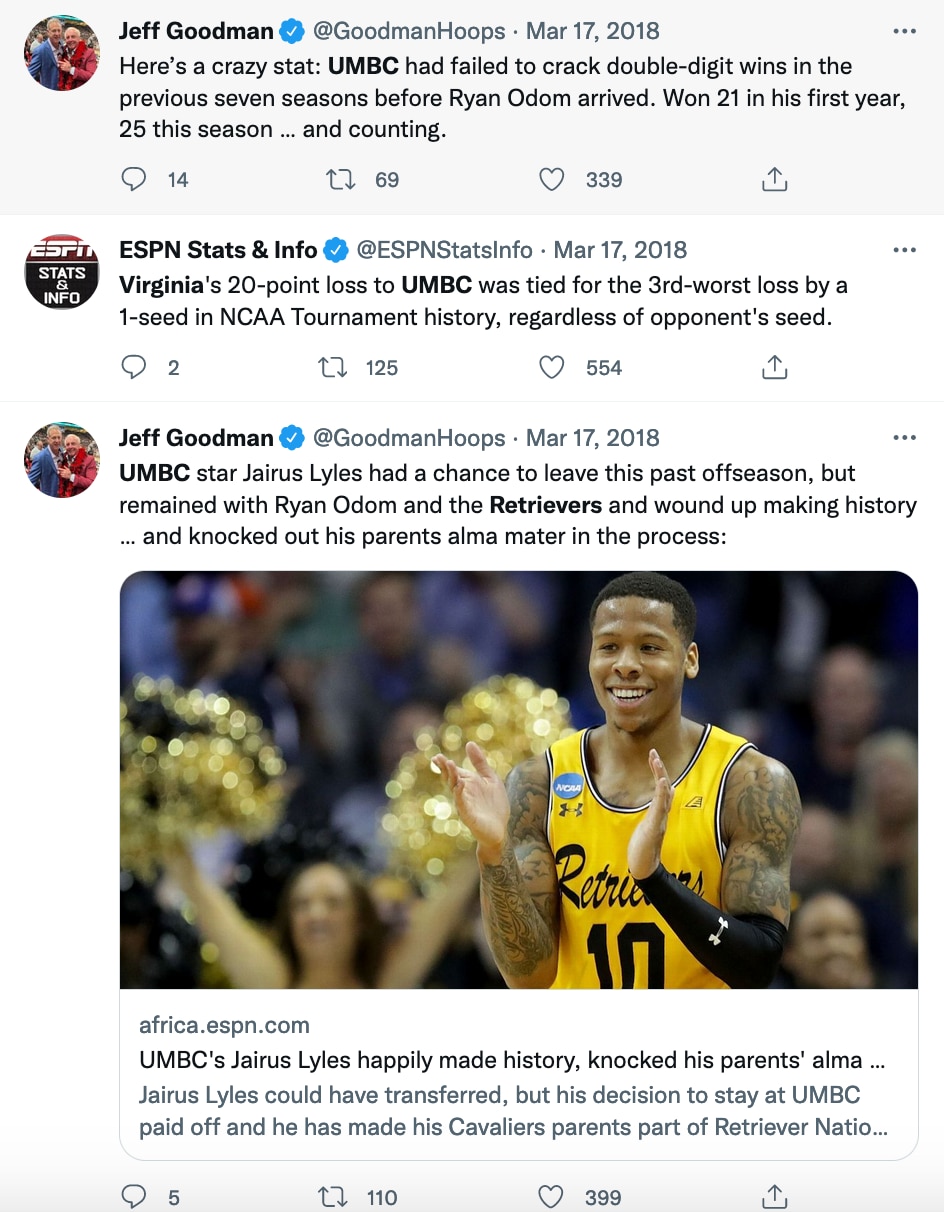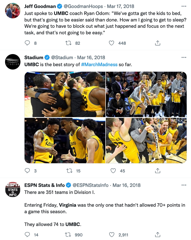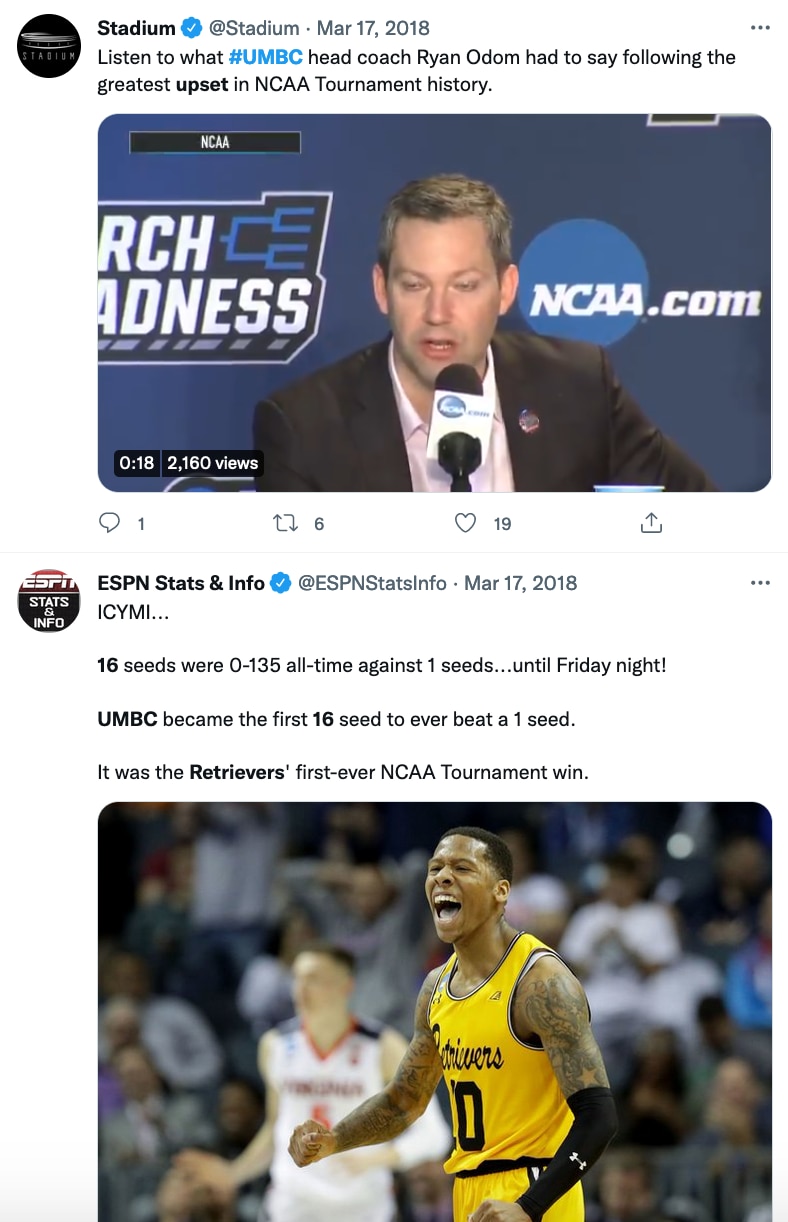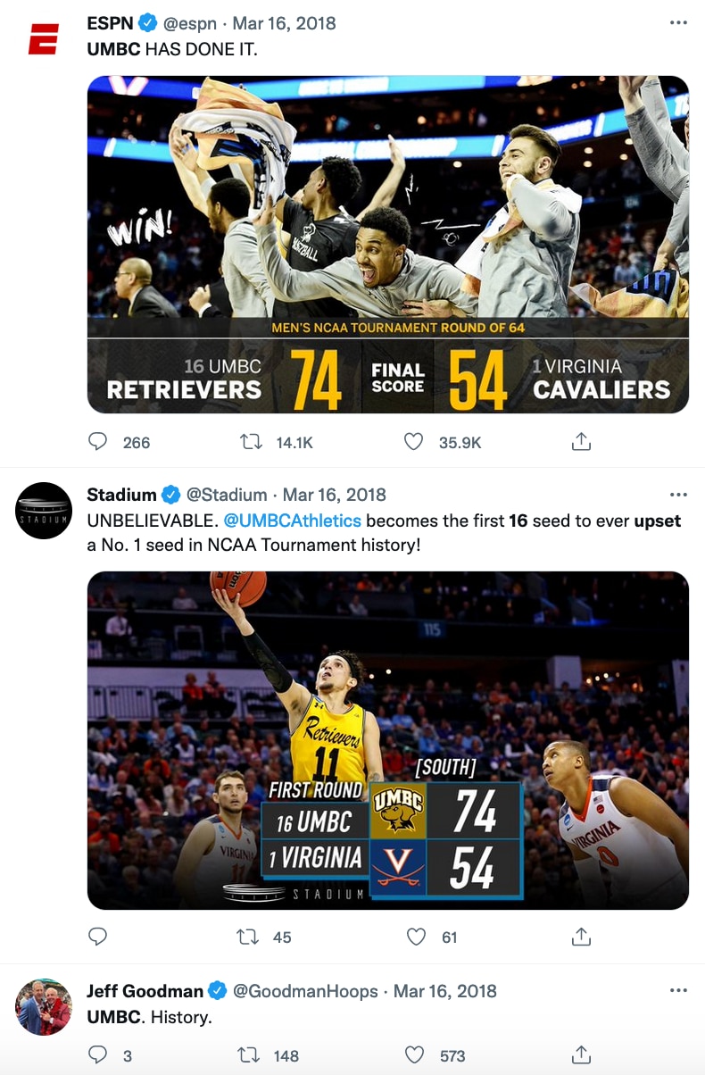As part of krikya369.com's NCAA Video Vault series, we're diving into UMBC's historic upset as a No. 16 seed over No. 1 seed Virginia in the first round of the 2018 NCAA Tournament β the first 16-over-1 upset in the history of the men's tournament.