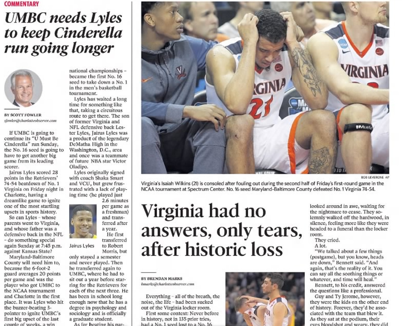 Soon thereafter, Virginia missed its 10th consecutive 3-point attempt, falling to one for 11 for the game, while UMBC was nine for 18 from deep. That's when Lyles reminded Virginia's defense of his interior scoring ability, as he drove, leading with the ball in his right hand, before switching hands and sending it back up with his left, off the glass. It was just another basket as he scored 12 in a row for UMBC.