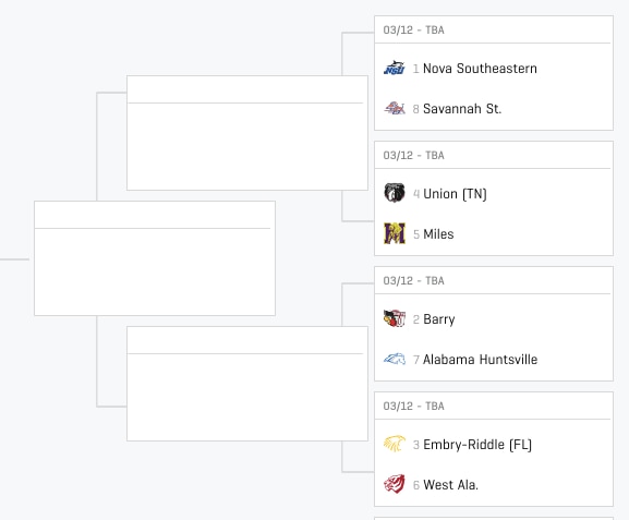 That was quick — here’s the No. 1 seed. Nova Southeastern is undefeated and handled a tough schedule to get there. This team is tops in DII in so many categories and has three of the best players in DII men’s basketball running the floor. Nick Smith leads DII in steals, assists and assist-to-turnover ratio, Sekou Sylla is a double-double seemingly nightly and RJ Sunahara can score with the best of them but is also one of the best defenders in the land. Plus, the Sharks have beaten Barry and Embry-Riddle multiple times, and those are the next best two teams in this part of the bracket.