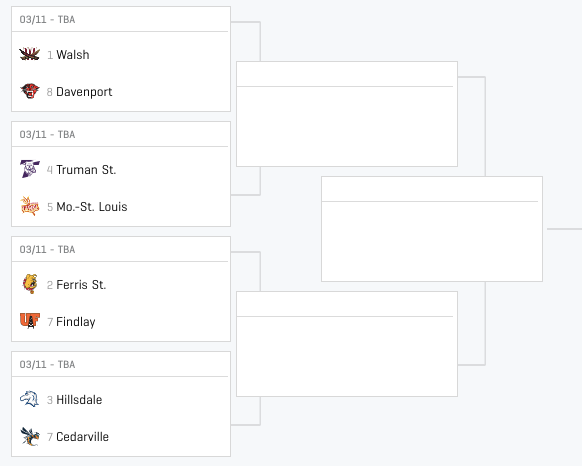 Since Bellarmine left for Division I, there hasn’t been much consistency in a single program owning this part of the bracket. And this was a wild part of the bracket, wasn’t it? Davenport and Missouri-St. Louis were outside the top eight in the final regional rankings and won their way in, bumping two teams from the mix. Ferris State was knocked out in the first round of the GLIAC tourney. March has already begun to March in the Midwest.
