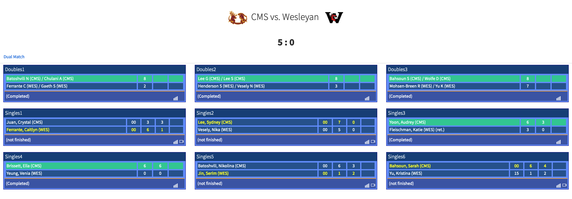 On Tuesday, Claremont-Mudd-Scripps swept Wesleyan (CT) 5-0, winning all three doubles points before Audrey Yoon (6-3, 3-0 (ret.)) and Ella Brissett (6-0, 6-0) won the No. 3 and No. 4 singles matches, respectively.