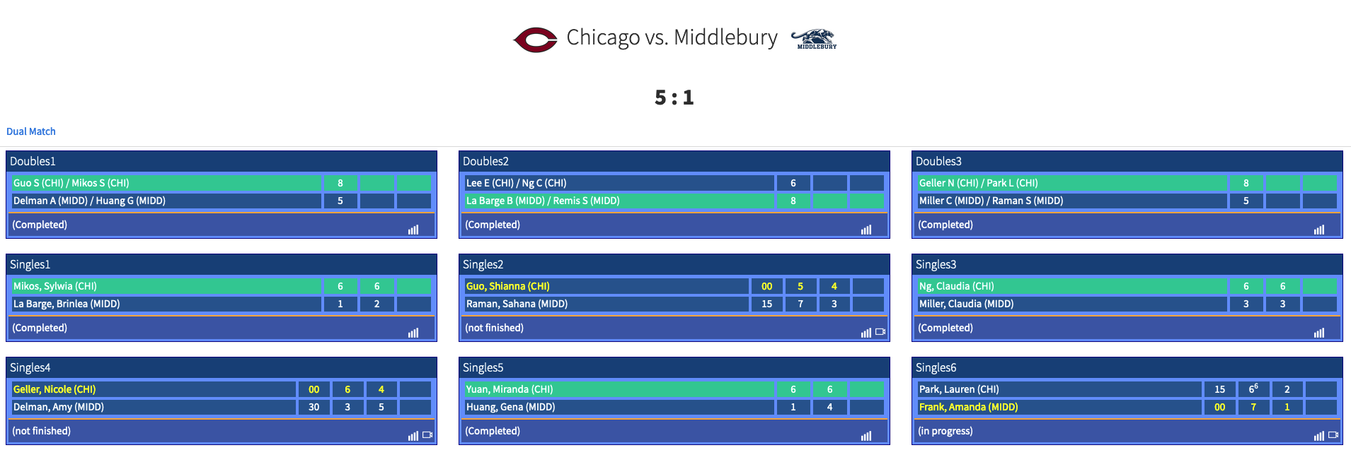 - Singles #3: Chicago's Claudia Ng vs. Claremont-M-S Audrey Yoon - DNF