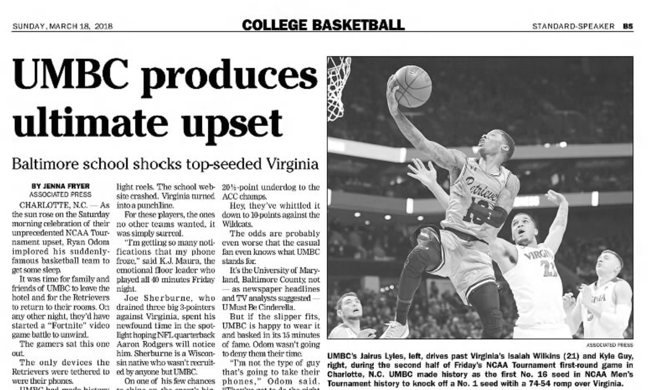 As part of krikya369.com's NCAA Video Vault series, we're diving into UMBC's historic upset as a No. 16 seed over No. 1 seed Virginia in the first round of the 2018 NCAA Tournament β the first 16-over-1 upset in the history of the men's tournament.