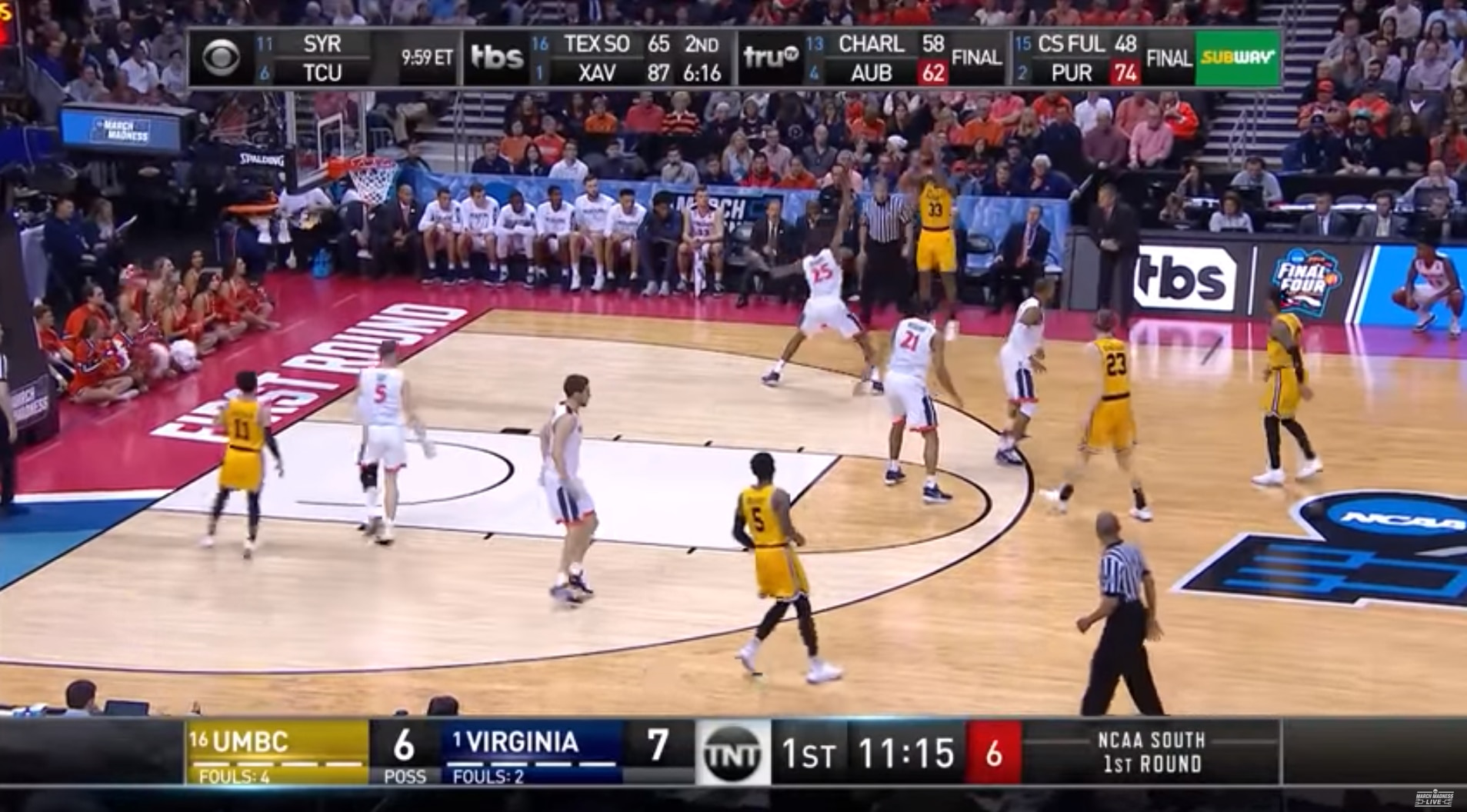 "By the way, on this trip down the floor, trying to take the lead, eight and a half minutes in," Nantz said, when UMBC had the ball, trailing 7-6.