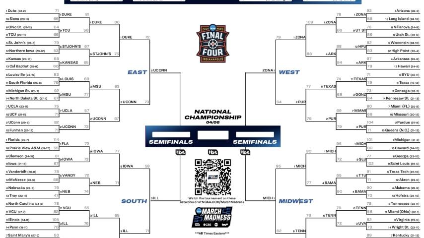While the 2024 foursome weren't quite as improbable as in 2023, when only six brackets came through with the combination of No. 4 UConn, No. 5 San Diego State, No. 5 Miami (Fla.) and No. 9 Florida Atlantic, No. 11 seed NC State's miraculous run to the 2024 Final Four ensured that just 297 brackets predicted all four national semifinalists. Most years see well under 1,000 entries going a perfect four for four.